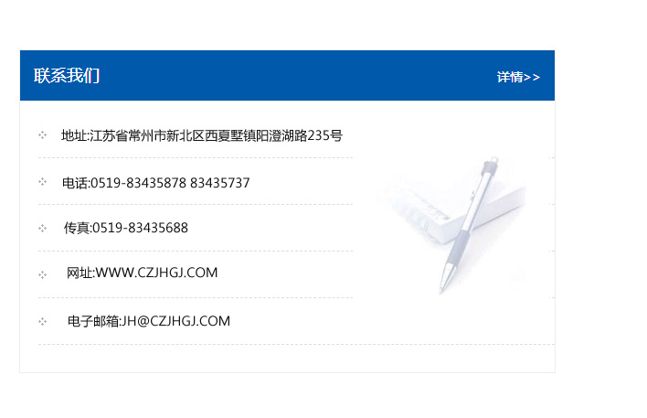 傳真:0519-83435688    郵編:213135    網址:WWW.czjhgj_com.hummerwbm.com    電子郵箱:JH@czjhgj_com.hummerwbm.com